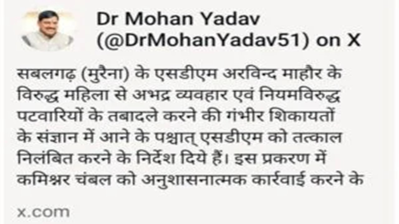 मुख्यमंत्री ने X (पूर्व में ट्विटर) पर पोस्ट करके बताया कि लोक सेवा में आचरण की गरिमा से कोई समझौता स्वीकार्य नहीं है। उन्होंने चंबल संभाग के आयुक्त को एसडीएम माहौर के खिलाफ अनुशासनात्मक कार्रवाई करने के स्पष्ट निर्देश दिए हैं।