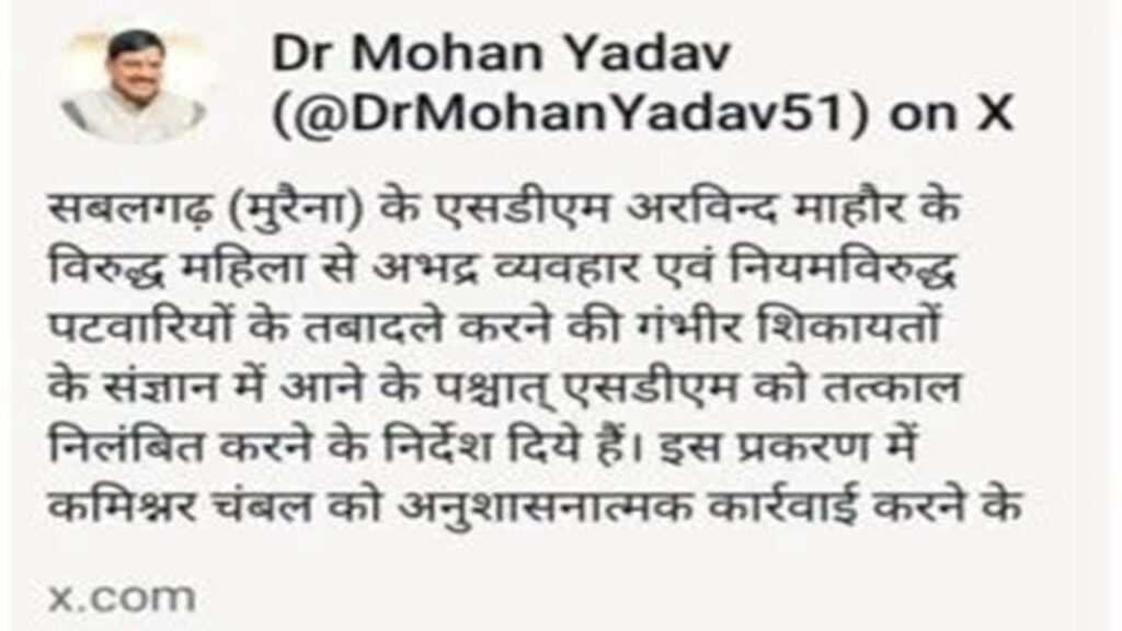 मुख्यमंत्री की सख्ती: महिला से अभद्र व्यवहार और अवैध तबादलों के आरोप में सबलगढ़ एसडीएम निलंबित